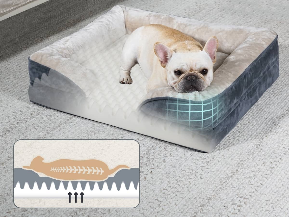 一般寵物床常使用廉價填充物料,易於短時間內塌陷變形。本品採用高密度蛋格型護理泡棉,能長久維持承托形狀,針對性釋放關節壓力;配合四邊加高承托設計,更可為頭頸部位提供卓越支撐